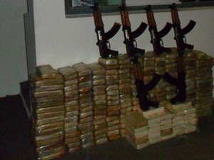 A droga estava escondida em um caminhão com placas de São Bernardo do Campo (SP). De acordo com informações da polícia, além da droga foram apreendidos seis fuzis novos com a numeração raspada e também os carregadores das armas.